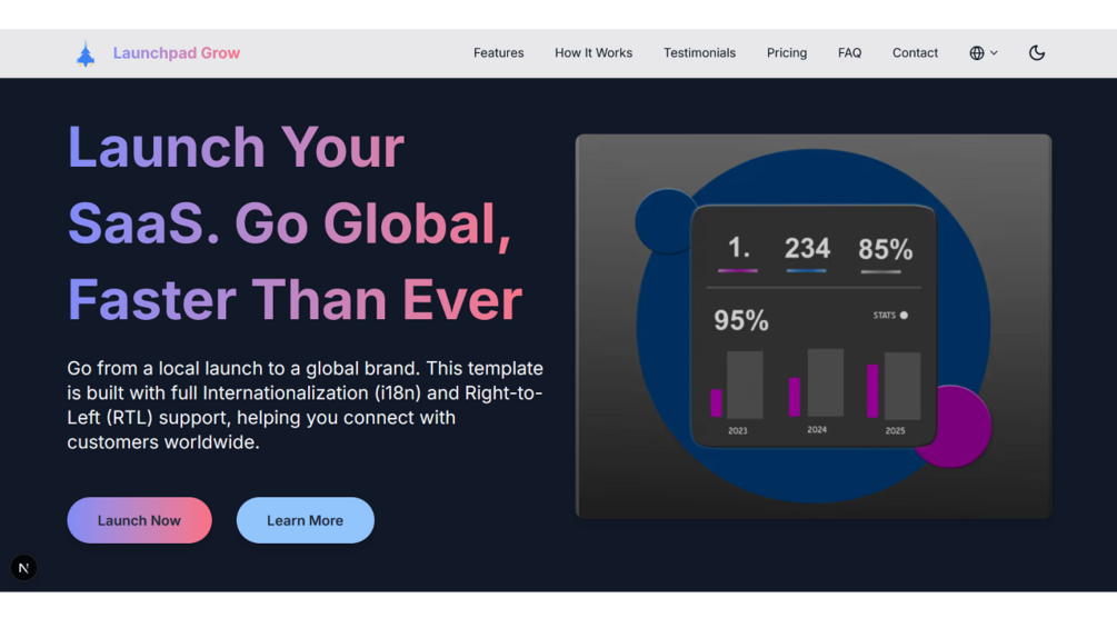LaunchPad Grow is a global SaaS landing page template made for founders, indie makers, and product builders who want to launch fast and scale confidently. With advanced internationalization, built-in SEO optimization, error monitoring, and conversion-focused layouts, it helps you create high-performance landing pages without complex backend setup. Powered by Next.js 15 and Tailwind CSS v4, it saves you weeks of work while giving your product a professional, search-friendly online presence.